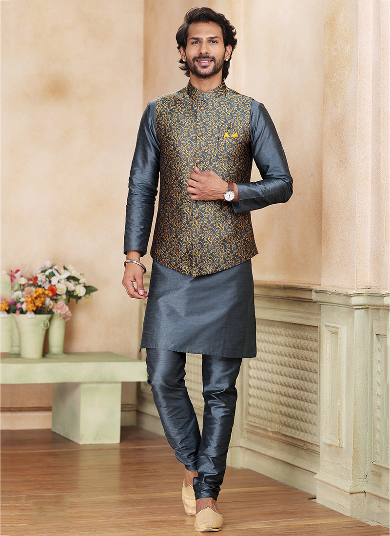 Product Speciality: Discover elegance and tradition with this beautifully crafted sherwani, perfect for weddings, festivals, and special occasions. Made from high-quality banarasi silk, this ensemble features intricate weaving that reflects timeless style.