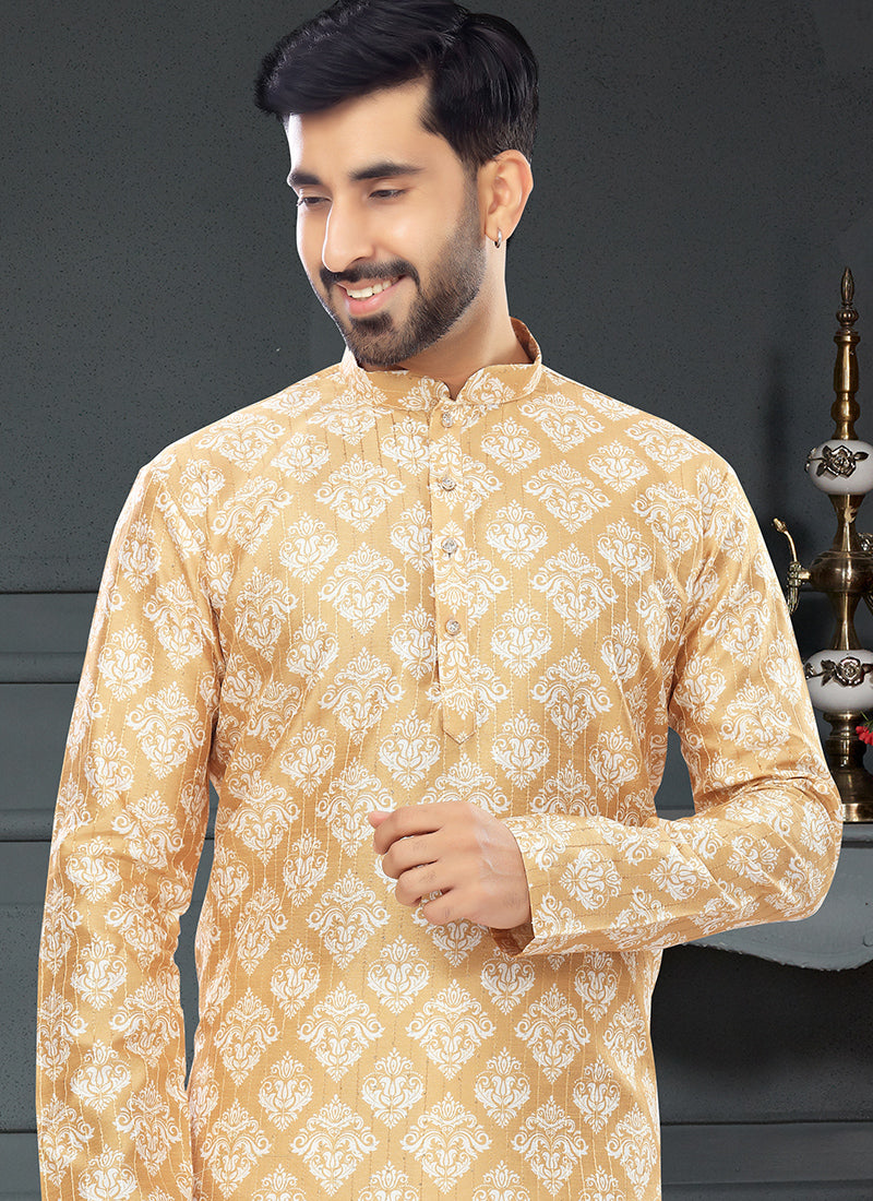 Gold Orange Silk Traditional Wear Digital Printed Kurta Pajama
