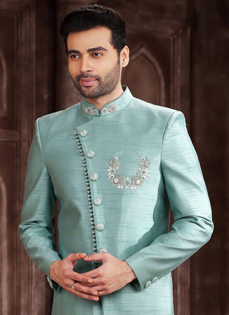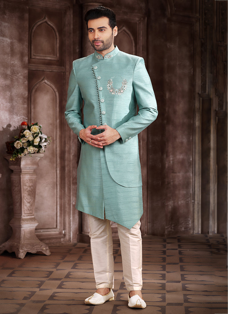 Product Speciality: Discover elegance and tradition with this beautifully crafted sherwani, perfect for weddings, festivals, and special occasions. Made from high-quality art silk, this ensemble features intricate embroidery work that reflects timeless style.