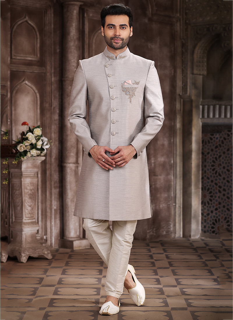 Light Grey Art Silk Wedding Wear Embroidery Work Sherwani