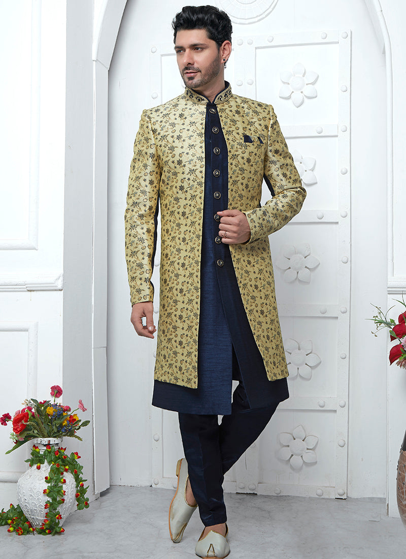 Beige Blue Jaquard Silk Party Wear Pattern Pc Work Readymade Mens Indo Western