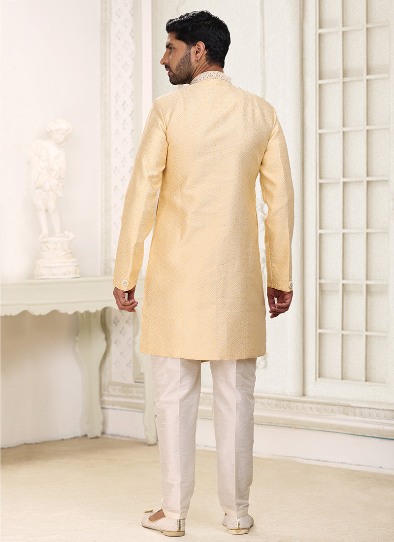 Product Speciality: Discover elegance and tradition with this beautifully crafted sherwani, perfect for weddings, festivals, and special occasions. Made from high-quality banarasi jacquard, this ensemble features intricate weaving that reflects timeless style.